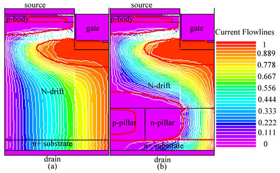 Distributions of current flowlines at Jds = 100 A/cm2 in (a) C-UMOS and (b) BSJ-UMOS.