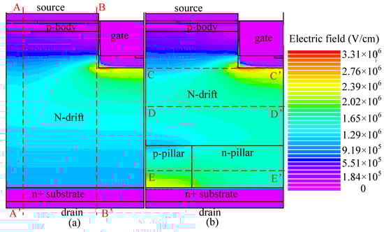 Electric field distributions at Vgs = 0 V and Vds = BV in (a) C-UMOS and (b) BSJ-UMOS.