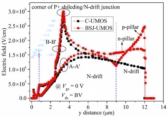 Electric field distributions of the BSJ-UMOS and C-UMOS along the AA’ (x = 0.5 μm) and BB’ (x = 2.0 μm) lines, as shown in Figure 5a.