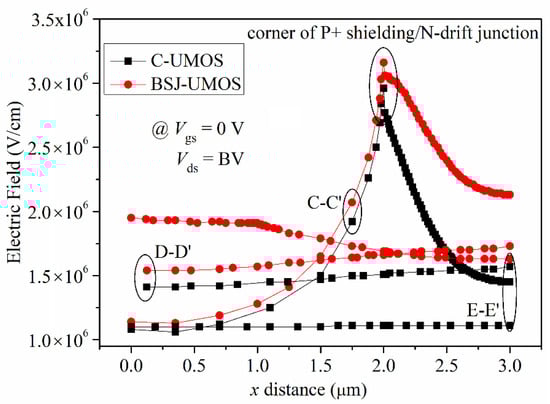 Electric field distributions of BSJ-UMOS and C-UMOS along CC’ (y = 3.4 μm), DD’ (y = 6.0 μm) and EE’ (y = 11 μm) lines, as shown in Figure 5b.