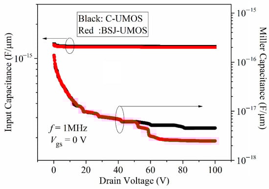 Figure 9 plots the parasitic capacitance performance (input capacitance Cies and miller capacitance Cres), indicating that the two structures have almost identical parasitic capacitance when the drain voltage is lower than 60 V. However, when the drain voltage is larger, the BSJ-UMOS has lower miller capacitance, mainly due to the p-pillar making the depletion wider in the n-drift region, as shown in Figure 10. In addition, this is due to the p-pillar being accelerated the depletion of the n-drift region.