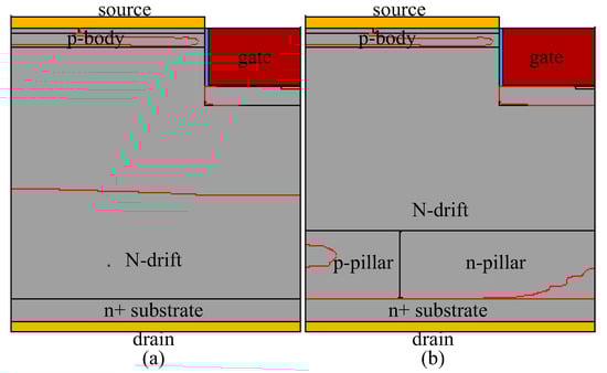 The 4H-SiC UMOS with a back-side super junction layer (BSJ-UMOS) is as shown in Figure 1b. The drift region of BSJ-UMOS consists of two parts, which are an N-drift region and a super junction layer, composed of the p-pillar and n-pillar. The super junction layer forms extra PN junctions on the drain-region side. As a result, a new electric field peak comes into being, which can modulate the original electric field distribution and improve the breakdown voltage.