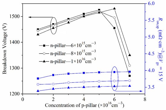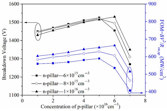 Figure 12 shows the effect of the concentration of the p-pillar and n-pillar on the BV and Ron,sp. As we can see from this, with the increasing of the n-pillar’s concentration, the specific on-resistance Ron,sp decreases, and the breakdown voltage is almost unchanged when the p-pillar’s concentration is lower 6 × 1016 cm−3 and then increases. The increasing of the n-pillar’s concentration makes the depletion layer narrower and the current flow path wider, leading to a reduction in Ron,sp. With the increasing of the p-pillar’s concentration, the BV first increases to the maximum value and then decreases, while the Ron,sp is almost unchanged. This is due to the charge in the back-side super junction layer being gradually balanced and then imbalanced, with the increasing of the p-pillar’s concentration. As we can see from Figure 13, the FOM has the same changing trend as the BV, and the changing reason is also the same.