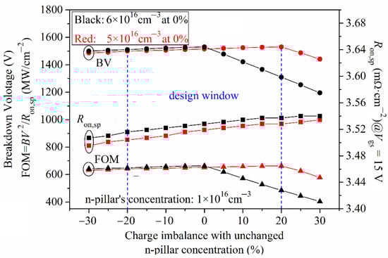 For a super junction structure, the charge imbalance is unavoidable and is a serious problem that has to be mentioned, especially for silicon carbide device processing technology. Figure 14 shows the relationship curve of the BV, Ron,sp and FOM versus the charge imbalance in BSJ-UMOS. Ideally, the highest BV can be obtained when the charge is balanced. However, when the charge balance is broken, the breakdown voltage begins to decline from the highest value. A charge imbalance, changing from negative to positive, means that the p-pillar’s concentration increases, the depletion layer narrows down and, thus, the Ron,sp increases, as Figure 14 shows. From Figure 13, we can see that the highest BV and FOM are achieved when the concentrations of the p-pillar and n-pillar are 6 × 1016 cm−3 and 1 × 1016 cm−3, respectively. However, from Figure 14, it can be seen that the design window is wider when the concentration of the p-pillar is 5 × 1016 cm−3. In this design window, when the charge imbalance changes from –20% to 20%, the breakdown voltage is about 1500 V, and the FOM ranges from 642.12 to 663.52 MW/cm2, which is easy for the control of the process technology.