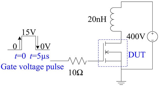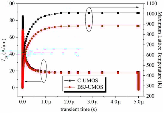 The short-circuit case is defined as follows: when the 4H-SiC MOSFET operates in the conduction mode, the high-voltage source is directly biased at the drain electrode, due to the shorting of the load [31,32]. At the same time, a high drain current flows through the device with a high drain voltage, which generates a high power loss and makes the device’s temperature increase. From the I-V performance (shown in Figure 3), the BSJ-UMOS has a lower saturation current due to the introduction of the p-pillar, meaning an increased short-circuit capability. The test circuit of the short-circuit characteristic is shown in Figure 15, and the simulation results are presented in Figure 16, in which the drain current pulse is caused by the inductance load. As expected, compared with C-UMOS, BSJ-UMOS has a lower drain current and minimum lattice temperature during the short-circuit case, since the existence of the p-pillar shrinks the current flow path. Owing to the lower lattice temperature, BSJ-UMOS has an improved short-circuit capability.