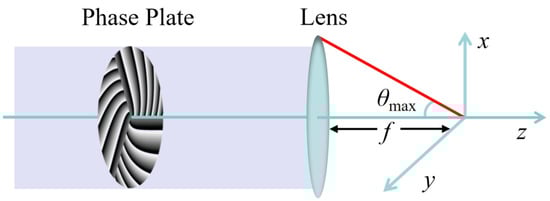 In order to fabricate the chiral microstructure using MHCBs, let us first start to study the propagation properties of MHCBs in a high-NA lens-focusing system as shown in Figure 1. Figure 1 illustrates the geometry of a tightly focused system. The incident light beam goes through the designed phase plate and is focused by a high-NA lens with focal length f. The height of the incident light beam is h. Thus, , where is the angle between the ray direction and the optical axis. Furthermore, , where . Here, we consider a plane wave or fundamental Gaussian beam as an incident beam and let it reflect from a diffractive phase element; for example, a phase plate or phase-modulated spatial light modulator (SLM). Then, the light field at the initial plane can be simply given as