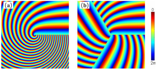 According to Equation (1), the phase distribution of MHCBs is plotted. The phase described by Equation (1), while similar to the phase of the fractional vortex beam, is totally different because the phase step varies linearly with r and the phase becomes continuous around an azimuthal circuit at . Figure 2 shows the comparison of phase distributions of the two MHCBs. Figure 2a shows the phase distribution of the MHCBs with the number of multiramp and , which is a traditional HCB, whereas Figure 2b shows the phase distribution of the MHCBs with and . Moreover, the phase distribution of MHCBs with is divided into three parts. Each part of the phase can be used to generate HCBs.
