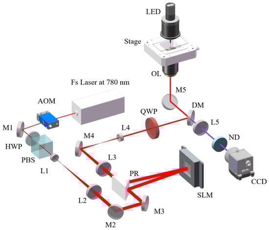 We used this kind of beam to fabricate the micro-structure based on TPP. The laser direct writing system in our experiments is schematically shown in Figure 3. Experimentally, the femtosecond laser source is a Ti: sapphire laser with dispersion precompensation (Chameleon Vision II, from Coherent Inc., Santa Clara, CA, USA), with a central wavelength of 780 nm, a pulse width of 140 fs, and a repetition rate of 80 MHz. MHCBs are generated by a reflection-type phase-modulation SLM (SLM, X15223-02 LCOS-SLM, Hamamatsu, Pohotonics, K.K., Hamamatsu, Japan) with 1276 × 1024 pixels, 12.5 μm pixel pitch and have 15.9 mm × 12.8 mm of the active area in the experiment. The linearly polarized beam from a femtosecond (with nm) first passes through AOM (MT110-A1.5-IR, AAOpto-Electronic, Orsay, France) worked at 110 MHz frequency, and the first-order diffracted beam is selected. AOM works as a high-speed optical switch to turn on/off the incident light beam. A half-wave plate and a polarized beam splitter were used to control the intensity and polarization of light. A beam expander (L1, L2) was used to expand the optical beam width to 2 mm. The expanded beam was reflected by a prism reflector onto the face of SLM, with the incident angle at 5 degrees. Here, the phase pattern on the SLM needs to be corrected by a background-compensated phase due to the imperfect flatness of the SLM surface and the wavefront of the incident beam. The SLM was placed at the front focal plane of L3. L3 and L4 form a system to image the modulated light MHCBs into the front focal plane of the objective lens (OL, 100×/1.45 NA, Nikon, Tokyo, Japan). The quarter wave plate converts linear polarization to circular polarization. Finally, the MHCBs were focused onto a sample located under the focal plane of an objective lens, and a chiral microstructure was achieved under single exposure. The modulated MHCBs and the fabricated sample can be viewed by a CCD camera. The neutral density filter was used to protect the CCD from damage by the high optical intensity. The sample was mounted on a 3D adjustable platform (E545, from Physik Instrumente (PI) GmbH and Co. KG, Karlsruhe, Germany) with a 2 nm resolution and a 300 m × 300 m × 300 m moving range to precisely locate microstructures. After fabricating, the samples were developed in polyethylene glycol methyl ether acetate (8 min), isopropyl alcohol (2 min).