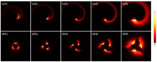 There are some previous works related to the evolutions of the MHCBs. Strictly speaking, those beams with helical–conical phases are different from our design since we used the phase function given by Equation (2), which possesses a multiramp structure. Moreover, no work has been carried out experimentally on investigating the tight focusing property of such a kind of beam. Therefore, in order to understand the propagation properties of the MHCBs in the tightly focused system, we have simulated intensity distributions near the focal plane of the objective lens in our direct laser writing system. Figure 4 plots the numerical intensity distributions of the tightly focused MHCBs when they gradually approach and move away from the focal plane of the objective lens, which is shown in Figure 3. The focusing was carried out with a high-NA oil-immersion objective lens and the refractive index of the oil was . As the beam propagates in such a high-NA system, its intensity profile changes with respect to the propagation distance rapidly. It is observed in Figure 4a1 that, when MHCB with parameter is at a distance of away from the focal plane, there exists a curved moon-shaped main lobe of light intensity rotating along the center of the optical axis, and some weaker side lobe light intensity distribution is in the periphery. As the beam approaches the focal plane—see Figure 4a1,a2—the strongest light intensity in the main lobe of light intensity rotates around the optical axis. At the same time, the peripheral side lobes contract together. The intensity distribution at the focal plane is very clearly observed as a spiral shape as shown in Figure 4a3. As the light passes through the focal plane, the spiral light intensity gradually spreads out to form a wider band-like light intensity distribution, and, at the same time, the center of the strongest light intensity rotates around the optical axis in Figure 4a4,a5. For the MHCB with , three main lobes with some side lobes can be observed in the intensity profile in Figure 4b1,b2 when . As it approaches the focal plane, three spiral shape intensity distributions are clearly seen; see Figure 4b3. The location of the maximum intensity in the three main lobes continuously twists around the central propagation optical axis, which is similar to the MHCB with . As it propagates to the position at , the side lobes near the main lobe appear again and there are some interference strips between the three main lobes. It is also the difference between MHCBs with and . Furthermore, it can be concluded that the number of main lobes is dependent on the number of multiramp mixed screw-edge dislocations m.