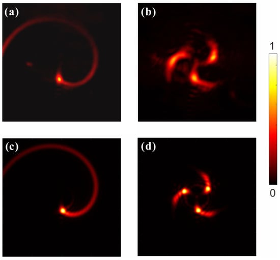 Figure 5 shows the experimental and numerical simulation results of the MHCBs propagating in the high-NA objective lens system for direct laser writing. Figure 5 shows the comparison of the actual images taken on the CCD camera with the numerical results for MHCBs under different parameters. Figure 5a,c show the experimental and theoretical intensity distributions, respectively, for the MHCB with and at the focal plane of the objective lens. It is clearly seen that the measured intensity profile is in good agreement with the theoretical result. The intensity distribution on the focal plane is very clearly represented as a spiral shape. Similar results can also be found in the case of MHCBs with and .