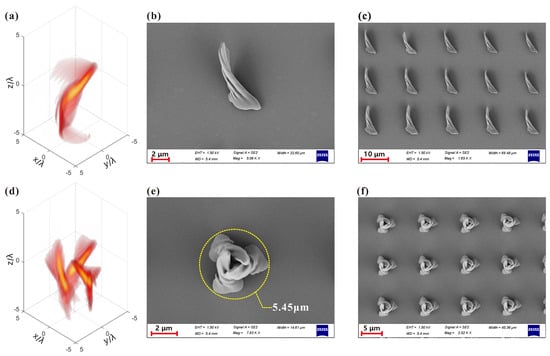 After understanding the tightly focused properties of MHCBs in an objective lens system, the MHCBs wre utilized to fabricate 3D chiral structure in the direct-laser-writing-system-based TPP as shown in Figure 3. The left column of Figure 6 shows the 3D intensity distribution of MHCBs with different parameters, which are used to fabricate the chiral microstructures. The resulting chiral structures were imaged by scanning electron microscopy (SEM) as shown in the middle and right columns of Figure 6 under the single exposure time ms and used laser power mW. It is seen that the chiral microstructure with only one subunit was fabricated when using MHCB with . However, when MHCB with , the chiral microstructure tat consists of three subunits was fabricated. In other words, the number of the subunits of the chiral microstructure is dependent on the parameter m on MHCBs. The outer diameter of such a chiral microstructure is approximately 5.45 m, which is marked by a dashed circle as shown in Figure 6e. In terms of the fabrication volume per unit time, our method is more than 20 times higher than point-by-point scanning for similar structures (detailed discussion in Appendix A). By moving the 3D adjustable platform collaboration with AOM as an optical switch, repeated chiral microstructures were fabricated, as shown in Figure 6c,f, which forms an array. These chiral microstructure arrays in possession of chirality may have great applications in optics sensing and optics detection [].