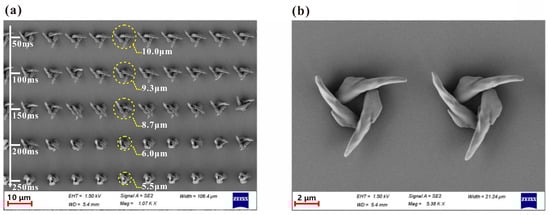 Figure 7 shows the effect of the single exposure time on the fabrication results of the chiral microstructure using MHCBs. We increased the single exposure time from 50 ms to 250 ms in increments of 50 ms as the white arrow shows in Figure 7a, whereas the used laser power was kept constant at . It was observed that the outer diameter decreases with the increase in the exposure time. However, the relationship between the outer diameter of the structure and exposure time is not linear. For example, when the exposure time is 50 ms, the outer diameter of the microstructure is approximately 10 m, whereas the outer diameter of the microstructure reaches 5.5 m with an exposure time of 250 ms. It can be explained that, when the higher exposure time is used, subunits of chiral microstructure tip towards the center and form stable microstructures. However, subunits tip towards the periphery when using a lower exposure time as shown clearly in Figure 7b.