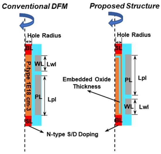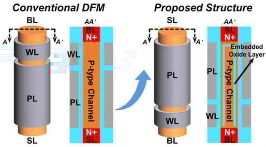 - Jeong, H.; Song, K.W.; Park, I.H.; Kim, T.H.; Lee, Y.S.; Kim, S.G.; Seo, J.; Cho, K.; Lee, K.; Shin, H.; et al. A new capacitorless 1T DRAM cell: Surrounding gate MOSFET with vertical channel (SGVC cell). IEEE Trans. Nanotechnol. 2007, 6, 352–357. [Google Scholar] [CrossRef]