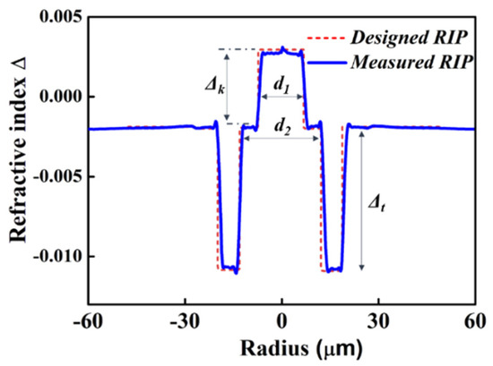 A trench-assisted multi-step designed refractive index profile (RIP) of the 2-LP-mode fiber is shown in Figure 1, which consists of a central core with a high refractive index embedded in the large core with a low refractive index and a refractive index trench around the whole fiber core. The design strategies of our optimized FMF are applied from refs. [3,6]. The DMGD and effective index difference (δneff) between the fundamental (LP01) and first higher-order mode (LP11) can be controlled by adjusting the Δk value precisely. By depressing the d2/d1 ratio properly, the effective area (Aeff) can be increased. Next, the trench volume (Δt) can be optimized to minimize the bending loss for these two guided LP modes while maintaining high losses for the higher-order leaky LP modes to ensure effective cut-off. Finally, an optimized RIP is obtained, where the values of Δk, Δt and d2/d1 are 4.2 × 10−3, 9.1 × 10−3 and 1.8, respectively.