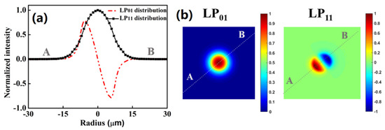where E (x, y) and u (x, y) are the electric field of optical mode and the displacement field of acoustic modes, respectively. The parameter λ is the wavelength of the optical mode in a vacuum. Additionally, ωa, VL and βa are the angular frequency, the velocity of longitudinal acoustic mode and the propagation constant of longitude acoustic modes, respectively. Using the finite element analysis (FEA) method and solving Equation (1), the electric field distributions at 1550 nm of two LP modes supported by the MSI 2-LP-mode fiber can be theoretically obtained, which are shown in Figure 2. The two-dimensional mode profiles of two LP modes in the direction of A to B are both shown in Figure 2b.