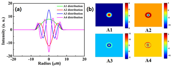 By solving Equations (1) and (2), the four acoustic modes, named A1, A2, A3 and A4, are calculated and shown in Figure 3. It can be found that these four acoustic modes are circular symmetrical and confined in the fiber core. The higher-order acoustic modes, A2, A3 and A4, may derive from the sharp rise and fall of the index profile of 2-LP-mode fiber between the center core and the edge of the larger core [11].