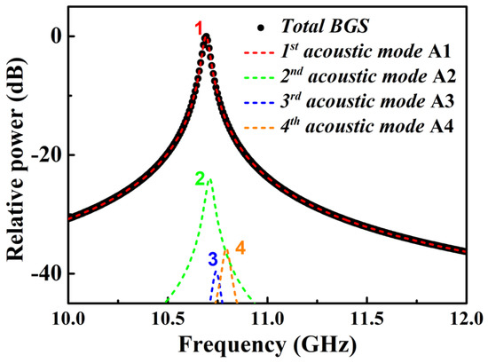 By solving Equations (1)–(5), the obtained numerical BGS of the optimized MSI 2-LP-mode fiber is shown in Figure 4. It can be observed that the intensity of the first peak is more than 23 dB higher than that of the second peak. The intensities of the third and fourth peak are both less than −35 dB. As shown in Figure 2 and Figure 3, the highest intensity of the first peak can be explained by the fact that the field distribution of A1 acoustic mode tends to concentrate more towards to fiber core, which can strengthen the optoacoustic interaction between A1 and LP01 modes. The second, third and fourth Brillouin resonance peaks are so weak that the total BGS of the optimized MSI 2-LP-mode fiber has a single-peak Lorentzian shape. Furthermore, it can be calculated that the Brillouin frequency shift (BFS) and FWHM of the main peak are 10.712 GHz and 31 MHz, respectively.