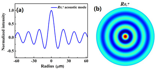 where hm is the eigenvalue of R0,m mode under the boundary condition corresponding to the free fiber surface, and ra is the radius of fiber cladding. Using , the density vibration of R0,m modes also can be obtained. Taking the R0,7 mode as example, the density vibration of the R0,7 mode and spatial distribution is shown in Figure 5.