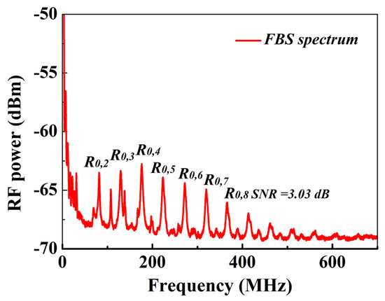 We also experimentally measure the FBSS of the MSI 2-LP-mode fiber using a Sagnac loop, and the measured results are shown in Figure 6. It can be found that the resonance frequencies of R0,m modes in the MSI 2-LP-mode fiber are equally spaced with a spacing of 47.03 MHz. By solving Equations (6), (7) and (9), the calculated resonance frequency of R0,7 mode is 322.7 MHz, which agrees well with the measured result of 319.7 MHz in Figure 6.