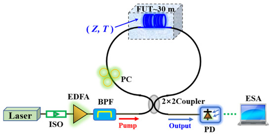 We experimentally investigate the frequency shift dependencies of BGS and R0,m-induced FBSS on temperature and acoustic impedance in the MSI 2-LP-mode fiber, respectively. The experimental setup is shown in Figure 7. The laser source is a 1552 nm single-wavelength fiber laser with a linewidth of 15 kHz and output power of 8.2 dBm. After passing through an isolator (ISO), erbium-doped fiber amplifier (EDFA) and bandpass filter (BPF), the pump light is injected into the fiber Sagnac loop composed of a polarization controller (PC), a fiber under test (FUT) made of an uncoated 30 m-long MSI 2-LP-mode fiber and a 2 × 2 fiber coupler. In our experiment, the optical gain of EDFA is adjusted to 11.2 dB, and its noise figure is suppressed to 5 dB. The BPF has an ultra-narrow 3 dB bandwidth (<3 GHz) and high optical signal-to-noise (<50 dB) so that it can filter the amplified spontaneous emission (ASE) noise from EDFA as much as possible. The insertion loss of BPF is 2.1 dB. In the FUT, the excited R0,m modes and longitude acoustic modes can both apply acousto-optic phase modulation to the propagating light [15]. Then, the fiber Sagnac interferometer can convert these two types of phase modulation into intensity modulation, which will be detected by a photo-detector (PD) with 12.5 GHz bandwidth. Finally, the lower-frequency FBS spectrum and higher-frequency BGS can be simultaneously observed and analyzed by an electrical spectrum analyzer (ESA). The frequency range of ESA is from 1 Hz to 26.5 GHz, and the spectrum is averaged 500 times.