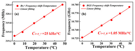 Firstly, the MSI 2-LP-mode fiber is placed into a water bath to measure the FBS spectra and BGS as a function of temperature, respectively. As shown in Figure 6, taking consideration of the signal-to-noise ratio (SNR) and R0,m modes induced FBS spectra dependencies on temperature (note that some low-order R0,m modes exhibit the higher SNRs but lower frequency shift-coefficients [14]), the R0,7-induced FBSS is selected to investigate its frequency shift dependencies on temperature. As shown in Figure 8a,b, it can be clearly observed that, within the range from 0 to 50 °C, the frequency shift dependencies of R0,7-induced FBSS and BGS on temperature show the linear relationships with the different frequency shift-temperature coefficients of Cν-T_7 = 25 kHz/°C and Cν-T_B = 1.05 MHz/°C, respectively.