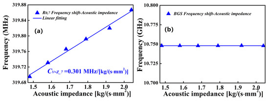 Secondly, the FUT is immersed into the sucrose solution with different mass fractions of sucrose, which are from 0 to 50% with steps of 10%. The temperature of the sucrose solution is kept constant at room temperature (~20 °C). The relationship between the concentration of sucrose solution and acoustic impedance can be found in ref. [26]. From Figure 9a, it can be found that, with increasing acoustic impedance, the central frequency of R0,7-induced FBSS linearly shifts to high frequency with a coefficient (Cν-Z_7) of 0.301 MHz/[kg/(s∙mm2)]. Interestingly, a new feature can be observed that the measured central frequency of BGS remains nearly constant when the acoustic impedance is changed to 2.02 kg/(s∙mm2). It means that the BGS is insensitive to the changes in acoustic impedance, and the frequency shift-acoustic impedance coefficient (Cν-Z_B) can be approximately expressed as zero. As shown in Figure 3, this feature can be explained by the fact that the total longitude acoustic modes and BBS process are confined in the fiber core, which can be isolated from external matter.
