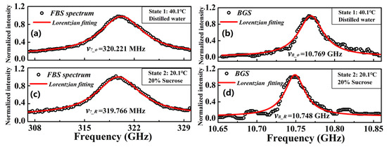 In order to compare our experiment with the existing results in the literature more conveniently, the 40 °C distilled water (the corresponding acoustic impedance is 1.505 kg/(s∙mm2) [27]) is set as State 1, and the 20% sucrose solution (the corresponding acoustic impedance is 1.689 kg/(s∙mm2) [26]) is set as the State 2. The actual temperatures of these two measured states are controlled at 40.1 °C and 20.1 °C, respectively. In our experiment, the measurement uncertainties of R0,7-induced FBSS and BGS can be obtained by calculating the standard deviation of seven measured results [14,20], which are 1.6 kHz and 157 kHz, respectively. Figure 10a,c show the measured R0,7-induced FBSS at State 1 and State 2, where the corresponding central frequencies (ν7_0 and ν7_R) are respectively 320.211 MHz and 319.766 MHz, respectively. Figure 10b,d show the measured R0,7-induced FBSS at State 1 and State 2, where the corresponding central frequencies (νB_0 and νB_R) are 10.769 GHz and 10.748 GHz, respectively.