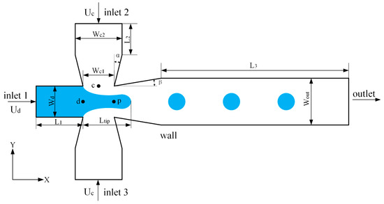 The flow-focusing microchannel is a typical axisymmetric microchannel, consisting of a dispersed phase inlet and two continuous phase inlets to form focusing holes. The microbubble generation is achieved by passing the dispersed and continuous phases through the focusing holes. The geometry of the flow-focusing microchannel is shown in Figure 1. The geometry is fully defined by six parameters, namely the orifice width (), continuous phase inlet constriction width (), continuous phase inlet width (), outlet width (), constriction angle (), and expansion angle (), where the orifice width is 2 μm and the continuous phase inlet width is 2 = 4 μm. To facilitate the uniform adjustment of the structural parameters, the dispersed phase inlet width is kept the same as the orifice width, and the continuous phase inlet constriction width and outlet width are normalized to the orifice width as shown in Equations (1) and (2).