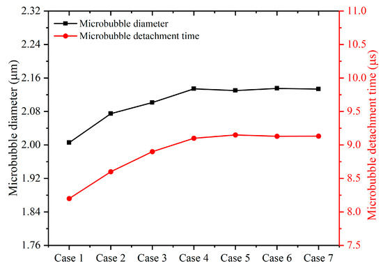Usually, the smaller the grid is, the more accurate the calculation results are; however, the smaller the grid is, the more computational resources are consumed. In order to find the most economical mesh size, the unstructured mesh is used to mesh the 2D geometric model of the flow-focusing microchannel. Since different design variables affect the number of meshes, seven scale sizes () are selected for the meshing from cases 1 to 7. As shown in Figure 2, the variations between the minimum and maximum values of the microbubble diameter and microbubble detachment time are only 0.24% and 0.55%, respectively, from cases 4 to 7, indicating that the grid cells meet sufficient accuracy requirements. Therefore, to balance the accuracy of the calculation results and computational cost, = grid cells are chosen for meshing the geometric channels in the subsequent simulations.