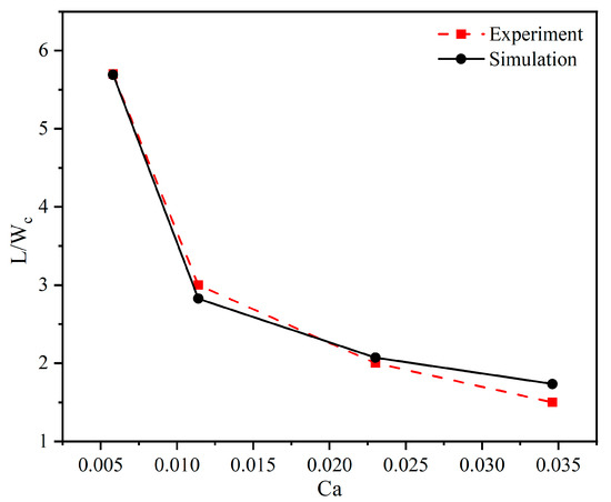 In addition, to verify the accuracy of the current numerical simulation calculation method, the numerical simulation results were compared with the experimental results in [28], as shown in Figure 3. The figure shows that the microbubble formation results obtained from the numerical simulation agree well with the experimental results. The average error between the simulated and experimental values is 6.27%, which is within the acceptable range. Therefore, it can be concluded that the numerical simulation method used in this paper is accurate and feasible for characterizing the two-phase flow patterns within the flow-focusing microchannels.