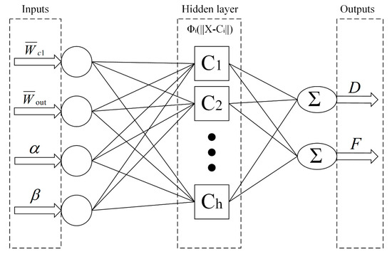 A surrogate model with design variable parameters () and the objective function after the response of each sample point was developed, where the optimization metrics included the diameter () and frequency (). In this work, the four parameters of the design variables were used as variables in the input layer, and the response of the output layer was obtained by transforming the hidden layer. The RBF topology of this work is shown in Figure 4.