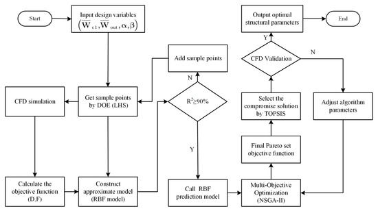 NSGA-II has good robustness and convergence. It ensures a uniform distribution of non-inferior optimal solutions, which are less likely to fall into local optima during the search process. It is especially suitable for dealing with nonlinear problems that are difficult to be solved by traditional search methods. In this paper, flow-focusing microchannel optimization was a complex mixed-variable nonlinear problem. Therefore, this paper used the NSGA-II to solve the multi-objective optimization problem. The flow chart of multi-objective optimization based on RBF and NSGA-II is shown in Figure 5.
