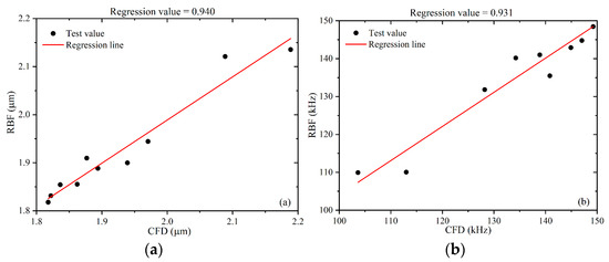 It can be seen in Figure 6 the relationship between the simulated and predicted values of the flow-focusing microchannels by linearly fitting them; the evaluation coefficients are 0.940 and 0.931 for the two targets, respectively, based on the calculation of the above equations. The RBF predictions of the two objective functions are close enough to the computational fluid dynamics (CFD) test values, indicating that the developed RBF model is reliable and sufficient to design flow-focusing microchannel structures.