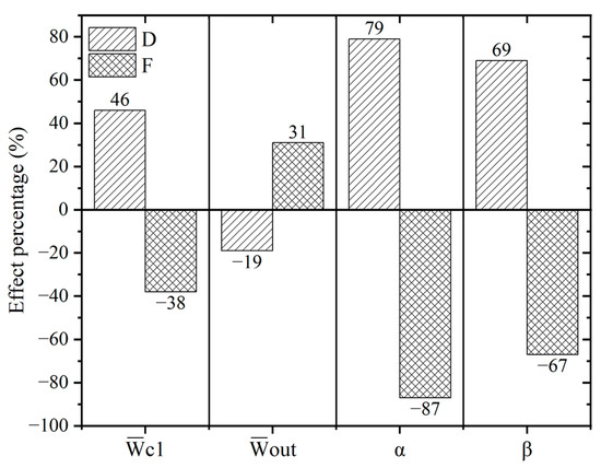 In sensitivity analysis, the input variables of Pearson and Spearman linear correlation analysis are correlated with a certain objective function [36,37]. The results of the sensitivity analysis of the model are shown in Figure 7. As can be seen from Figure 7, the constriction angle is positively correlated with the microbubble diameter. It has the highest effect on the microbubble diameter (79%), followed by the expansion angle (69%) and the continuous phase inlet constriction width (46%). The outlet width has the least effect on the diameter (−19%), negatively correlated with the diameter.