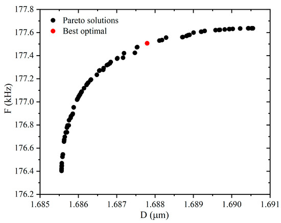 Figure 8 shows the Pareto optimal frontier diagram between the objective functions (red dots are optimal solutions). Each frontier solution represents the trade-off between the two objective functions. It is worth noting that the points on the Pareto front are optimal and are not dominated by each other. Each point corresponds to a specific structural parameter and optimization objective. To select the appropriate design point from many optimized design points to meet the requirements of practical engineering applications, TOPSIS is used to obtain the structural parameters corresponding to the final optimization results from the Pareto front, as shown in Figure 8. The objective values of the compromise solution are 1.6877 and 177.507, and the corresponding combinations of input parameters are = 0.9, = 2.6, = 10, and = 5. The results of the error analysis of the predicted results with the numerical simulation show that the relative errors of the diameter and frequency are 0.43% and 1.17%, respectively, as shown in Table 3. This indicates that the predicted values are consistent with the CFD calculation results. The results show that the multi-objective optimization method based on RBF, NSGA-II, and TOPSIS proposed in this paper is effective.