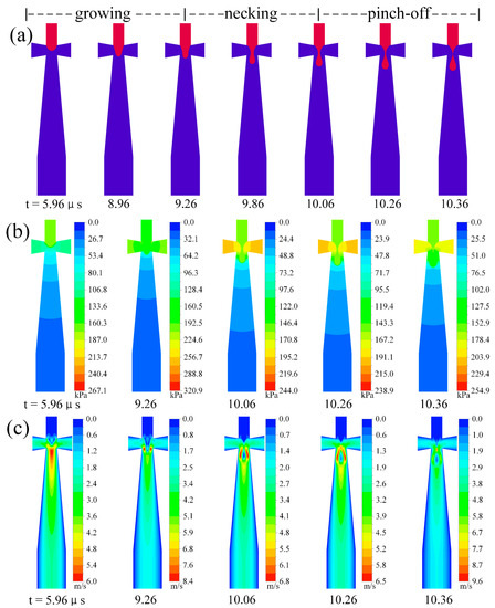 Time evolution of hydrodynamic information during microbubble generation in improved microchannel (Ca = 0.0139, Ud = 0.2 m/s): (a) evolution of the interface, (b) evolution of pressure field, and (c) evolution of velocity field.
