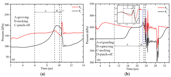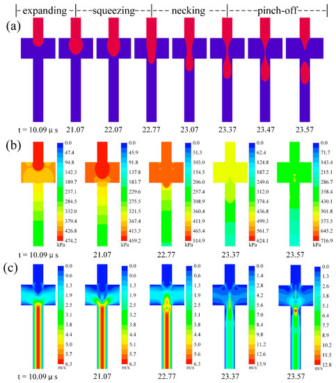 The time-dependent pressure and velocity contours near the intersection allow us to understand the generation of microbubbles under different microchannels. It is clear from the pressure contours (Figure 9 and Figure 10) that the pressure in the main channel is decreasing in sequence. According to the Laplace pressure theory, the surface tension between the two phases causes the pressure to jump at the curved interface, and the internal pressure of the microbubble is higher than the internal pressure of the surrounding stable phase. It can be seen that the gas continuously enters the main channel; as the water phase constantly squeezes the gas, there is a pressure drop; this pressure drop plays an essential role in the fragmentation of microbubbles. In the microbubble pinch-off phase, a high-pressure region can be observed near the separation point (see t = 23.57 μs in Figure 10b).