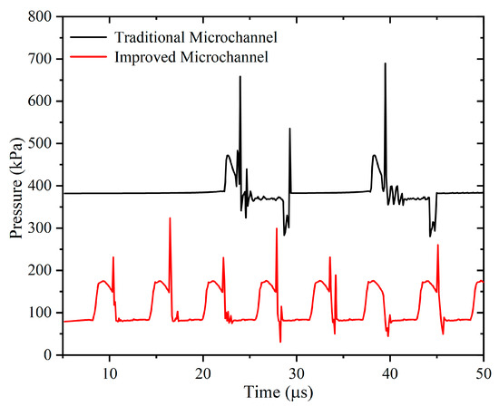 Figure 9 shows the time evolution of the hydrodynamic information during microbubble generation in the improved microchannel, where the flow regime is in the dripping regime. The process of microbubble generation in the dripping regime can be divided into three stages: growing, necking, and pinch-off. The initial phase of the first microbubble generation can be seen in the dripping regime (see t = 5.96–9.26 μs in Figure 9), where the front part of the dispersed phase threads mainly stretches toward the main downstream channel without significant expansion in the direction of the side channels. As the thread continues to extend into the main downstream channel, the transverse interface of the thread becomes concave. The necking phase (see t = 9.26–10.06 μs in Figure 9) begins with the formation of a neck, which contributes to necking and thread extension due to the enhanced squeezing of the continuous phase under the action of the constriction inlet, in combination with the viscous shearing effect of the continuous phase. After the necking stage, a pinch-off stage occurs (see t = 10.06–10.36 μs in Figure 9), where high pressure appears on both sides of the neck, and the pressure difference is generated with the neck further promoting the necking. It can be seen that the fragmentation and generation of microbubbles occur at the junction of two phases. Due to the improved continuous phase inlet channel in this paper, it will be found that the microbubble diameter is smaller than the channel width. In this flow state, microbubbles’ generation is consistent, stable, and uniform.