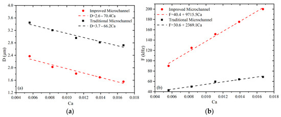 (a) Microbubble diameter (D) and (b) generation frequency (F) as a function of capillary number (Ca) (Ud = 0.2 m/s).