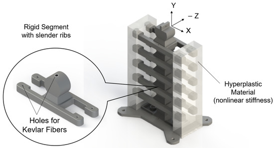 The musculoskeletal system consisted of six 3D-printed rigid segments (Figure 1) connected with hyperelastic material and Kevlar fibers. The hyperelastic material held both sides of the rigid segments of the full musculoskeletal assembly near the rib ends in the and directions (Figure 2). Additionally, Kevlar fibers ran internally through the neutral line of the structure. The rigid segments were fabricated using polylactic acid (PLA) with 35.9 MPa tensile strength and 4% maximum elongation [44]. The hyperelastic material was platinum-catalyzed silicone Ecoflex 00-30 with ∼900% rupture. The Kevlar 29 tensile strength was ∼2.75 GPa [45].