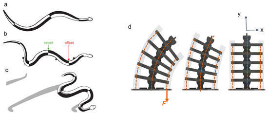 (a–c) Undulations in snakes [22]: the black-shaded areas are the muscle timing relative to bending in (a) swimming and (b) lateral undulation of a water snake and (c) sidewinding in a rattlesnake. The outside gray areas are past regions of static contact with the ground; note the onset and offset bending points. (d) Bends in our snake-inspired system: the transparent sections are the hyperelastic (soft) material connecting the ribs and providing antagonistic variable stiffness and energy storage–release. Kevlar fibers in the soft material and centerline provide actuation and prevent socket shifting, respectively.