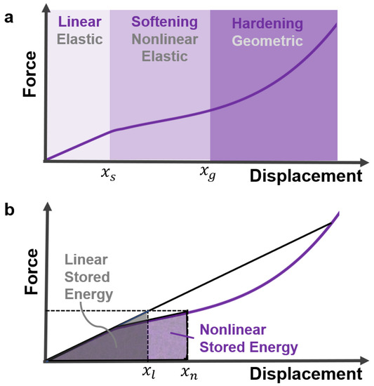 (a) Force–displacement curve of typical nonlinear hybrid compliance with linear softening (starts at ) and hardening (starts at ) stiffness regions; (b) note the linear and nonlinear displacements, and , respectively, for the same force. Thus, energy storage, the area under the curve, is higher in nonlinear (purple) than in linear (gray) hybrid compliance.