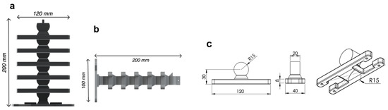 The overall musculoskeletal system’s height and width were 200 mm and 120 mm, respectively (Figure 5a). The dimensions of a rigid segment are provided in Figure 5b. Each rigid segment consisted of a disk–socket joint with two ribs on each side. The system’s total mass was approximately 220 g. All the rigid segments were allowed to rotate except for the bottom segment. The musculoskeletal system was attached to a rigid base metal plate to ensure a fixed boundary condition at the bottom segment.