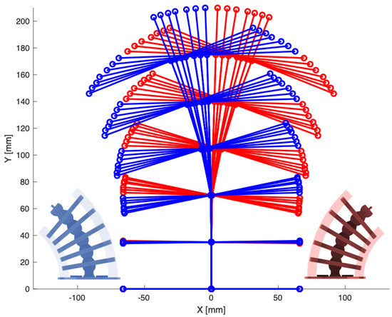 Using Tracker, the pivot points were identified and collected for each video frame, as shown in Figure 11. The horizontal and vertical axes were specified in each frame with a scale reference. The displacement measurements were converted to data format files to facilitate kinematic analysis using a customized MATLAB—code provided in Code S3 File. The code calculated the change in the angle of every rigid segment relative to the horizontal reference line for every frame, and the net angle, . The change in the distance d was obtained from the angle calculations. The change in distance d was utilized to calculate the stretch in the soft material, as detailed in Section 5.