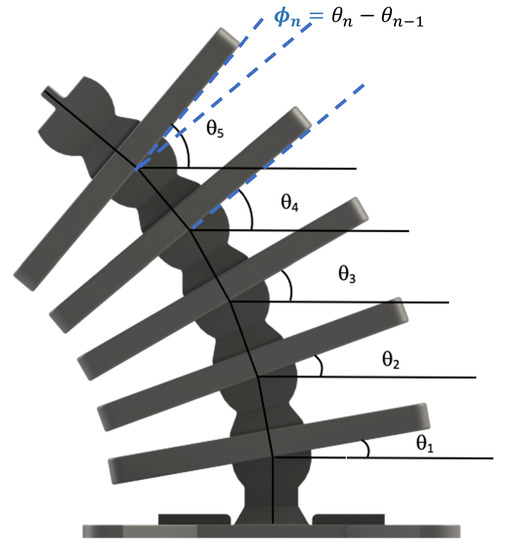 The angles are the degrees of freedom of the musculoskeletal system with respect to the horizontal axis. The bottom rigid segment is fixed. The angle is the displacement between segments n and .