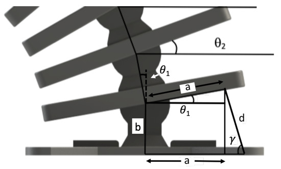 The angle in Figure 8 is of the fiber at the nth segment with respect to the vertical axis. The distance between pivot points n and is b, which is fixed. The horizontal distance a is from a pivot point to the side fibers. The resultant length between ribs n and is d. Due to the design symmetry of the system (Figure 8), the tip displacements of the nth rib at a can be calculated as follows: