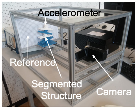 Assessing the energy release required obtaining dynamic parameters due to applying an impulse force, namely structural stiffness and damping. An acceleration sensor was utilized since the video camera lacked the required framerate needed to capture high-frequency undulations. Acceleration measurements were obtained using a lightweight (≈1.0 g) tri-axial sensor (5.0 mV/g sensitivity, Model 3133A3, Dytran Instruments, Inc., Chatsworth, CA, USA). The sensor was placed at the center of the top rigid segment of the system, as illustrated in Figure 10. The impulse force was delivered to the top segment in the horizontal direction (X) using a miniature modal hammer (21.1 mV/N sensitivity, Model 2302-100, Meggitt Endevco, Irvine, CA, USA). The sensor and impulse force placement at the top segment provided the most accurate measurements because the motion was maximum. The response was normalized by the input force.