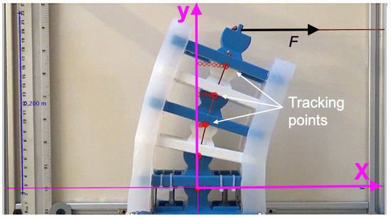 Video-tracking software called Tracker was utilized to extract the displacement data from videos for each image frame [6]. An example video is provided as a Video S2. Bending displacement was achieved by applying force in the vertical configuration and then switching to the horizontal configuration by rotating the musculoskeletal system by 90°, as illustrated in Figure 9a,b, respectively. The maximum applied force was 29.4 N for both configurations.