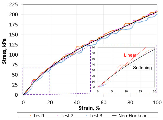 The silicone stress–strain response was obtained from uniaxial tension testing for three samples, as shown in Figure 12. Each sample was stretched up to 100% strain. The neo-Hookean model was applied to capture the soft-material deformation with reasonable accuracy (Figure 12). The neo-Hookean model is based on a strain-energy-density function given by the following expression [6]: