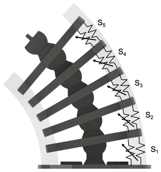Similar to a snake’s vertebrae, the rotation of each rigid segment induced the collective bending of the complete system, as shown in Figure 6. Therefore, the design strategy facilitated distributed actuation of the system through the soft material by simply applying tension forces carried by the fibers to rotate the rigid segments and cause stretch and contraction in the soft material. The material snapped back to an equilibrium state upon removing the tension forces—releasing the stored energy and returning the spine to the center line.